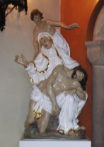 Darunter in hohem Relief befindet sich eine Mutter Gottes und darunter sind zwei Wappen, die einen Weidenbaum (für Weidenpetersdorf) und einen Baumstumpf mit Keil (für Rodestock = Rohnstock) darstellen.
